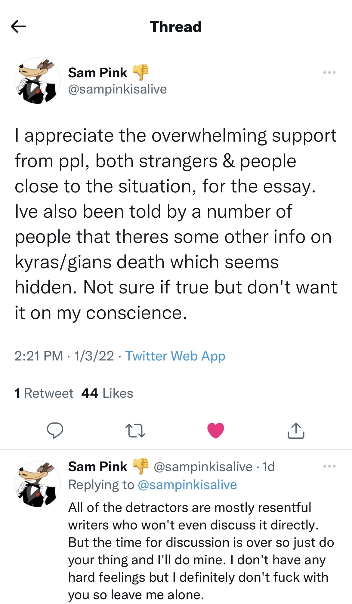(The layers to this story, like seemingly everything in the modern world, are complex, with each trap door, side quest, and rabbit hole designed to cement our pre-existing belief structure. Sam Pink, on January 3rd 2021, as I am editing this story, drops an unsubtle innuendo on Twitter related to Sean Thor Conroe’s role in the deaths of Giancarlo DiTrapano and an unknown individual named “Kyra.” While he quickly refuses to elaborate on his supposed information “because the people who have given me info are afraid,” the implications are clear enough. I feel absurd having to spell this out, but if Sam Pink’s “people” are correct then there are much bigger moral, criminal, and legal issues at play than stealing a literary style and if Sam Pink’s “people” are incorrect then the emotional harm and suspicion he has thrust on Sean Thor Conroe is extremely out of line.)