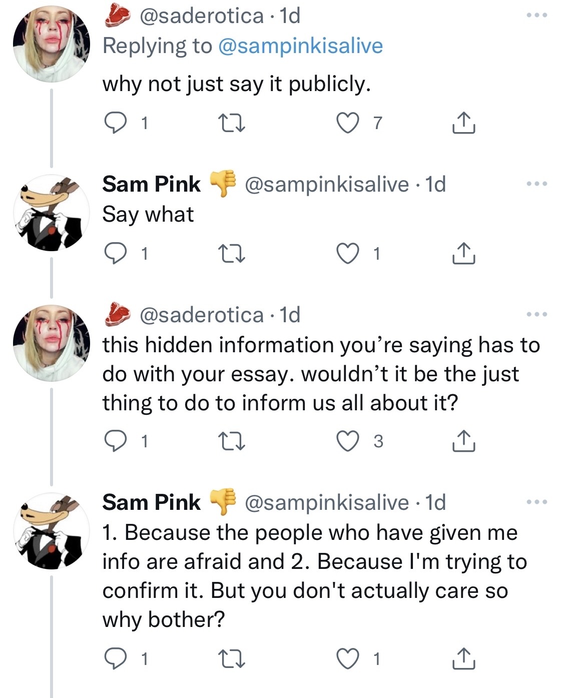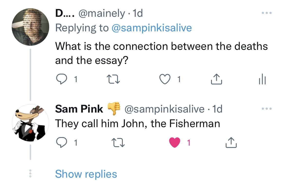 At one point, in the fall of 2021, a writer working on a story about Fuccboi reaches out to Sam Pink. Sam takes the opportunity to post her (completely kind and professional and normal) email to him to his 4,846 followers with the sick burn “Get a real job” and makes a comically obvious effort to not cover up her name. The ensuing article comes out in Vulture on January 3rd, 2021. The same day Sam Pink chooses to insinuate Sean Thor Conroe is involved in the premature deaths. Sam does this, clearly, to divert attention from the Little, Brown promotional machine behind Fuccboi, hoping once again to make the conversation about him and his stolen style without recognizing that his crusade against the author and the book are only doing Little, Brown’s work for them (and for free). The article itself gives space to Sam Pink’s side of the story and is respectful, but she is a woman and she works in New York writing about literature so he had to bully her. He wrote a 6,000-word blogpost about another author stealing his “entire work,” and someone had the audacity to be interested. She took Sam Pink’s side seriously and wanted to report on it. Sean Thor Conroe comes across, in the Vulture profile and every other, like an insecure loser and an aggressively unserious writer and person.  Sam Pink’s desire to remain unspoiled by the boogeyman of an imagined all-female squad of monied literary elites hatching plans to overtake the publishing industry in their sororities means his work threatens to be reduced to a footnote in the Sean Thor Conroe origin story.