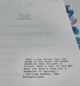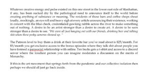 I decide I want to read the play Dimes Square by Matthew Gasda and actually review the piece of art as it appears on the page. I reach out. I find him responsive, polite, and he agrees to send me the unpublished play to review. The distance between us is immediately evident when, in that first (and still only) conversation between us he tells me I should put the play on myself, in a house down here, and I explain if I did so it would only be for the pleasure of my kids’ friends’ parents.