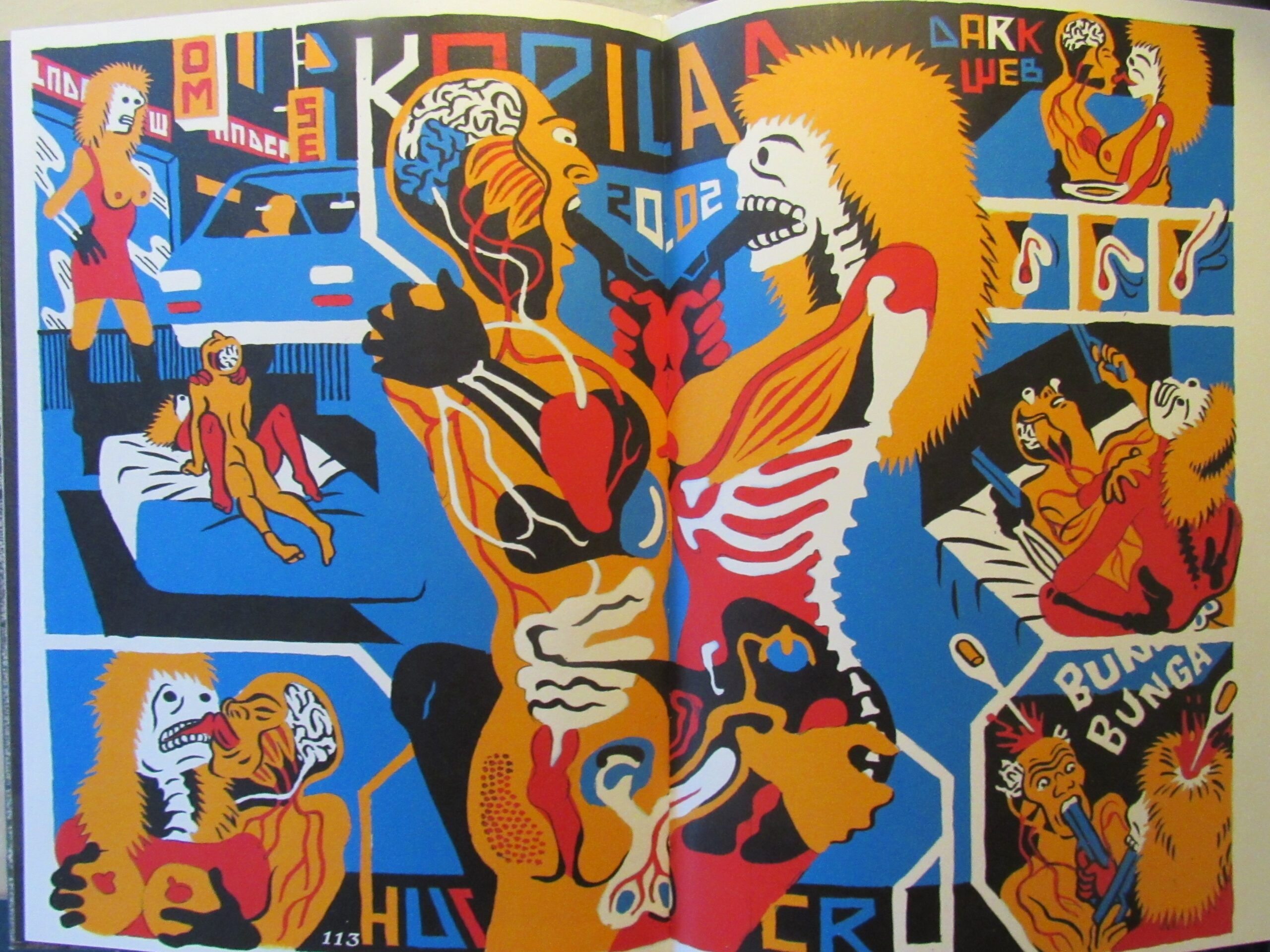 The anthology is 250 pages long, and even if you hadn’t flipped through it to get a quick voyeur’s look at the pages, you would quickly get the picture: this is a hallucinatory, colorful, racy, grindy collection of comics from international sources that you could say is for kids if the kids were the kind to hang out huffing paint thinner in a filthy alleyway in Mexico City post nuclear strike.