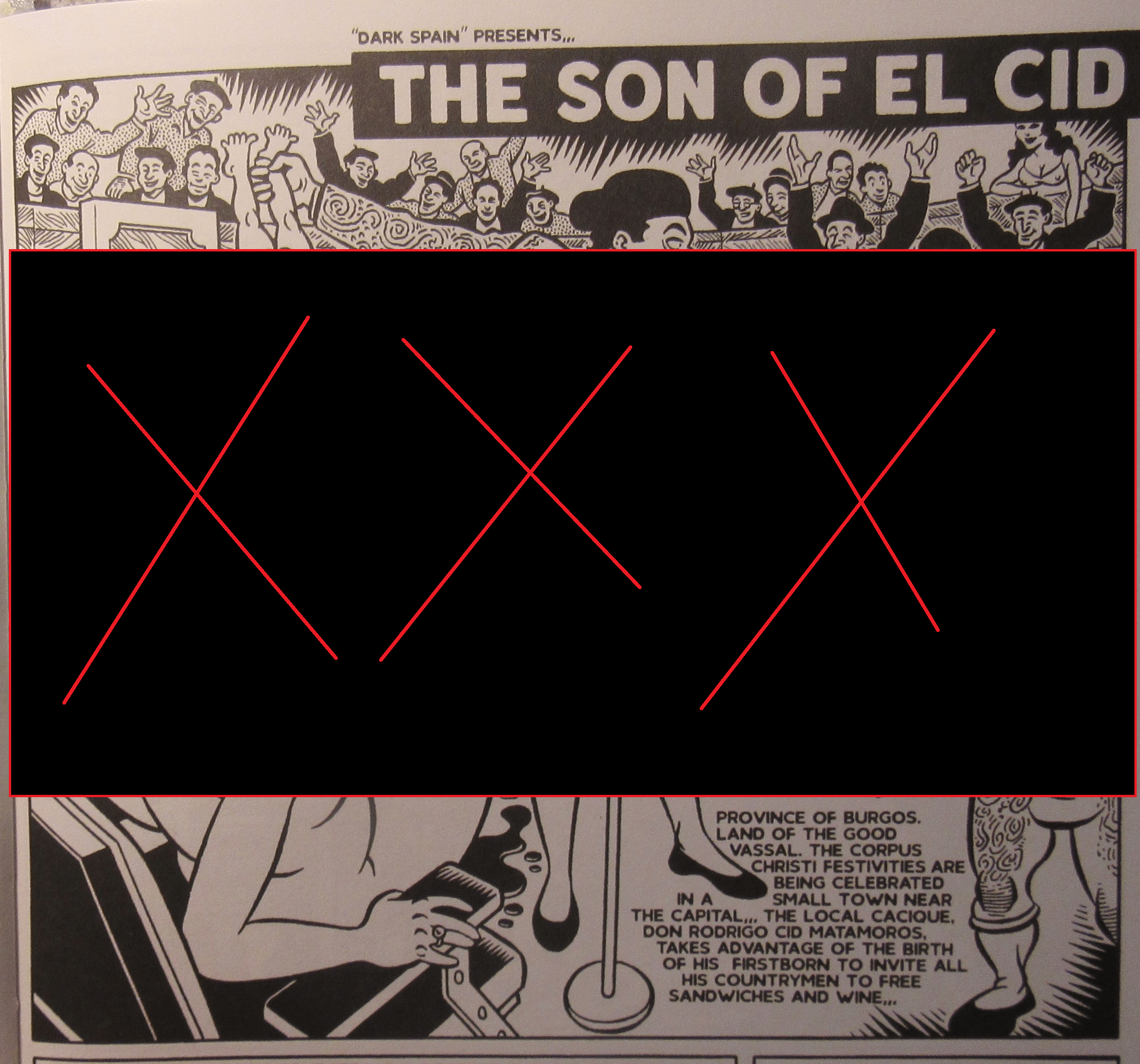 The endpapers reveal that part of the book was originally published in Barcelona, Spain by Ediciones La Cúpula, an international comics publisher which in addition to a plethora of Spanish comics takes on Spanish editions of Charles Burns’ Black Hole and the Fabulous Freak Brothers. These sections were, according to Schneider, the ones drawn by Spanish cartoonist Marti, and had to be translated into English by Luis Roldan Torquemada, exclusively for Freak Buck. Marti’s comics are as fucking dirty as a down-and-out Barcelona hooker’s mattress and insane: one draws heavily from Lynch’s disturbing industrial landscapes in Eraserhead and the other, “The Son of El Cid,” is a nasty chronicle of the citizens of a Spanish town, including a perverse patriarch who forces the mother of his child to give birth in a bullring so that the blood of the afterbirth will mix with the sand. Schneider: “[Marti] did a wonderful comic named The Cabbie that was published by the famous Fantagraphics and was in RAW a magazine edited by Art Speigelman (Maus etc.) We obtained the rights to some of Marti’s comics and translated it for the first time in English.”