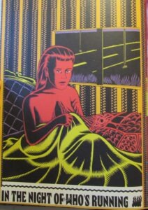 All this is told in a vivid colorful illustration that is without panels yet still has a multidirectional sequential flow as your eyes scan to all the corners of the page and gather visual information. The artist is Igor Hofbauer, and his art seems to all have the printmaker’s eye for bold colors and fields. Research shows Hofbauer is from Croatia, and his artwork is some of the best in the new anthology of comics and illustration known as Freak Buck, oozed out from Providence, RI publishers Pig Roast Publishing.