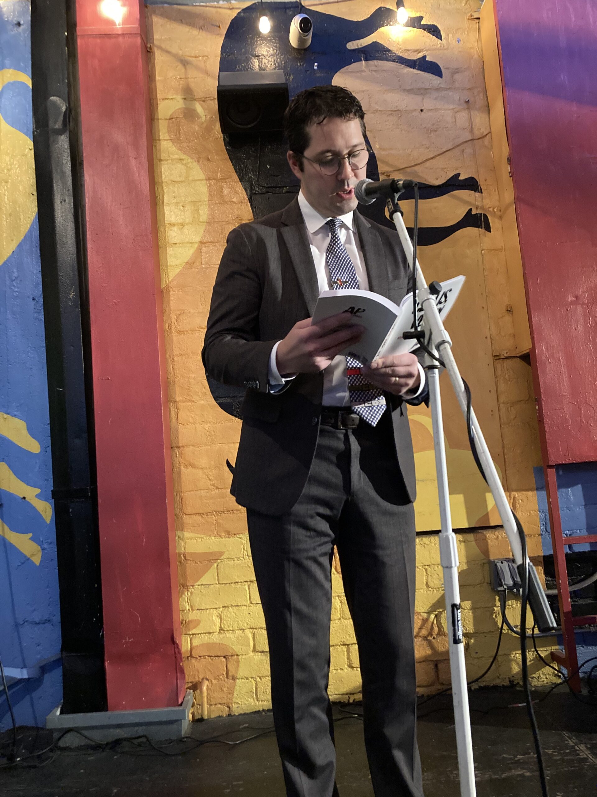 Adam Johnson is always from Minneapolis! He comes to L.A. very much for the reading in a premium grey suit. Before he performed, he told Gabriel Hart “Don’t tell audience I am a criminal defense lawyer, people hate lawyers.” He read from his new book Cialis! Verdi! Gin! Jag! and many people laughed. Also, many people felt discomfort. He said, “I think that’s enough for now!”
